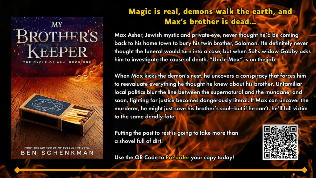 My need to read the next book in the series as soon as Ben has completed it cannot be overstated. I cannot remember the last time I have needed to read the next installment this badly. I loved the story, found the characters beyond interesting in a myriad of ways, and I fell in love with Ben’s urban fantasy world and the characters he has placed within it. I thought My Brother’s Keeper was the best introduction into this world and I look forward to seeing these characters again.